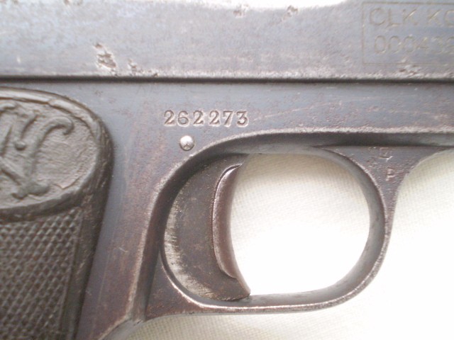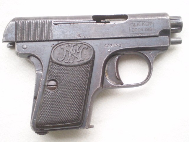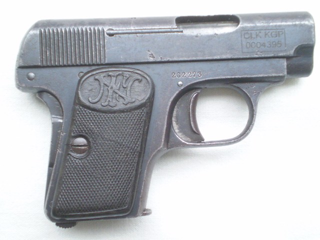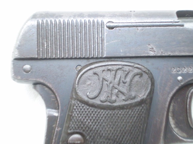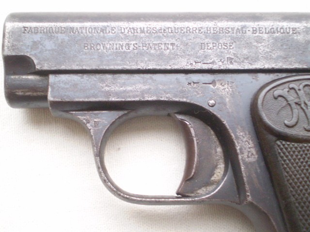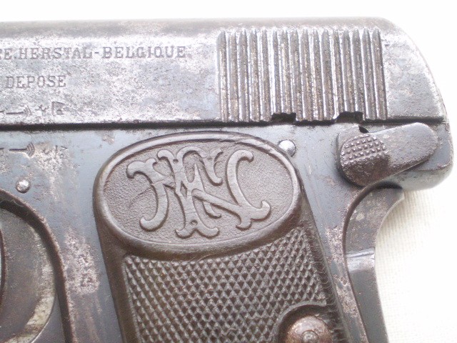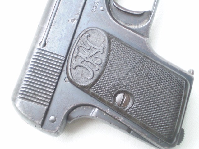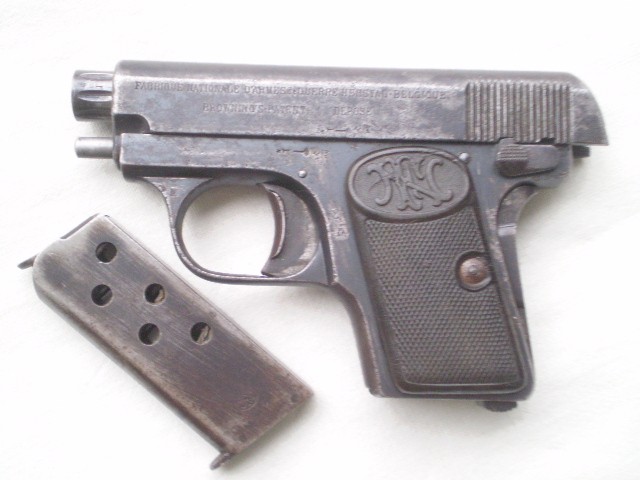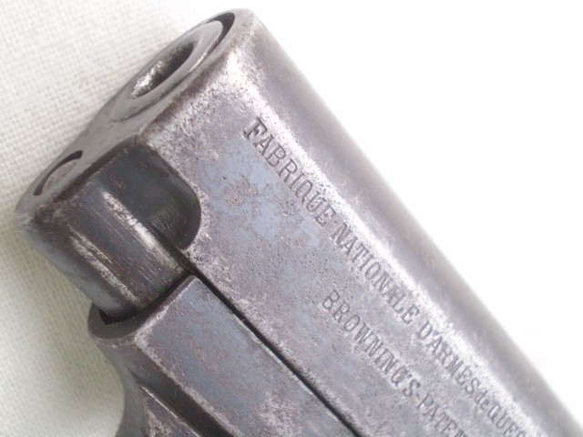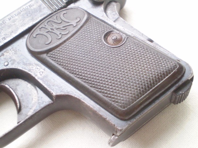 Belgijski pistolet samopowtarzalny FN Model 1906 ,skonstruowany przez Johna Mosesa Browninga.Miniaturowy pistolet w kalibrze 6,35 mm tzw. "szóstka". Stan techniczny dobry,ze śladami po usunietych ogniskach korozji,ale nie szlifowany ,ani nie "upiekszany".Zachowana oryginalna oksyda.Pistolet sprawny mechanicznie , można oddać "suchy strzał"